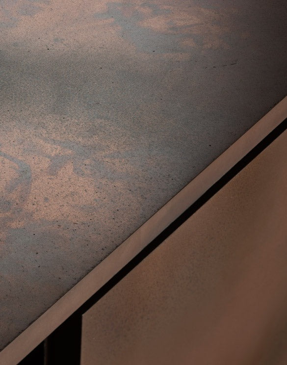 Metal graces stone, wood, glass and other materials with its purity and personality. This cutting-edge technique, that involves bonding the metals in liquid form to the surface, offers a variety of aesthetics and a multitude of different effects, from patina, aged and rusty to sleek and modern